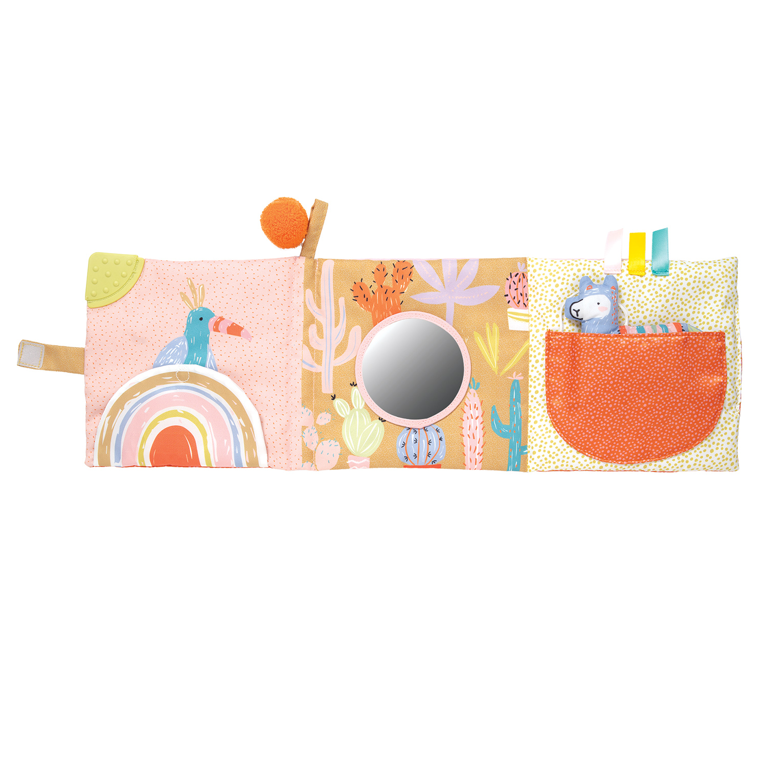 עקבו אחר הלאמה דרך פעילויות שונות בכל עמוד. ספר רך מתקפל כולל לאמה עם איורים צבעוניים, צלילים מקומטים, מראה בטיחותית לתינוק ומרקמים מרתקים.